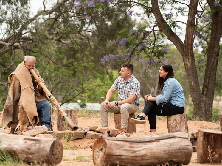 Sandhills Artefacts is owned by Michael Lyons. Michael is a Wiradjuri Elder who has accumulated a wealth of information about his ancient culture. Michael has two workshops and galleries located in Narrandera, NSW, which he can guide you through, showing in the first how he takes raw wood and turns it into traditional Didgeridoos, Boomerangs, Coolamons and more by soaking them in water, debarking, hollowing, sanding, carving, polishing and painting.